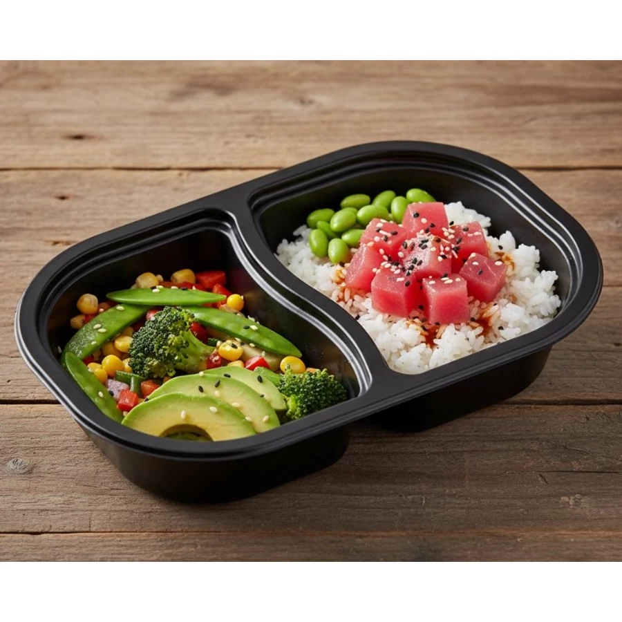 650 ml-es ovál 50/50 arányban osztott fekete PP doboz